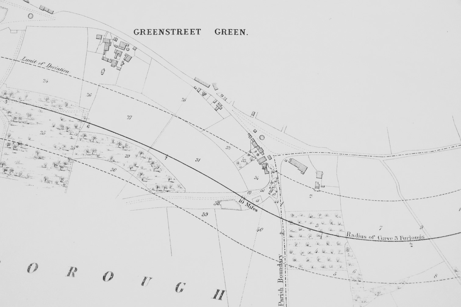These diagrams show the route skirting Farnborough to the north, about where Farnborough bypass now runs, and passing through Green Street Green.
