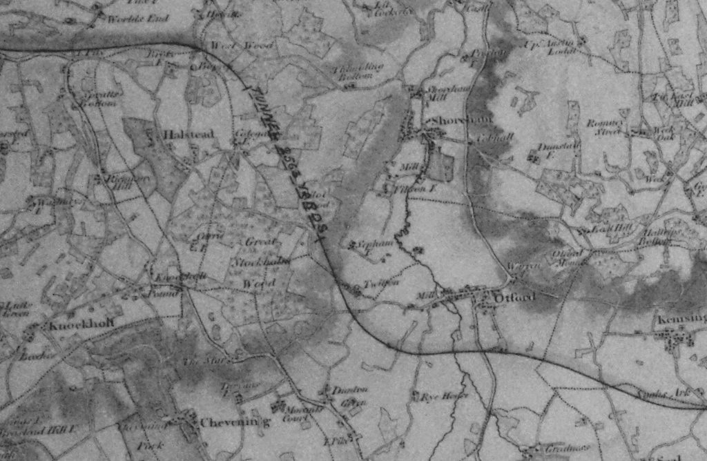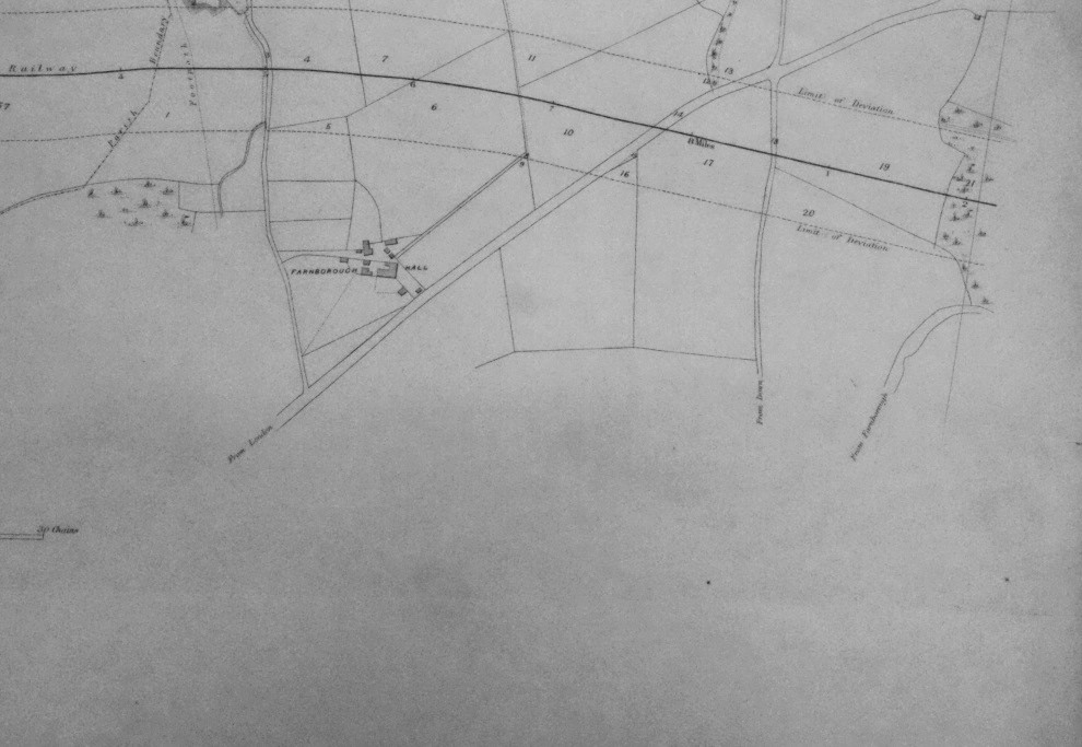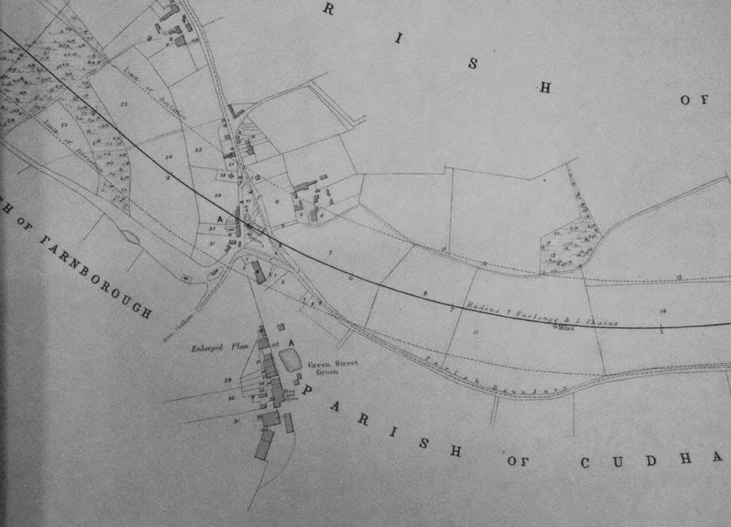 to Croydon and Brighton near Sydenham. It would then continue through Bromley and Farnborough to Green Street Green from where it would parallel the turnpike road to a tunnel through the North Downs at about the location of the eventual main line tunnel under Polehill. |