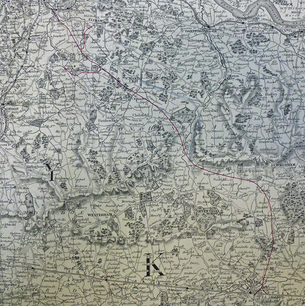 As can be seen from the maps it passed to the east of Bromley, with a connection to the proposed West End of London and Crystal Palace Railway line from Beckenham to Farnborough. It then continued between Orpington and St. Mary Cray to enter the Darenth Valley, which afforded the easiest way to the south, through the only gap in the north downs.