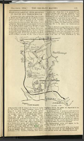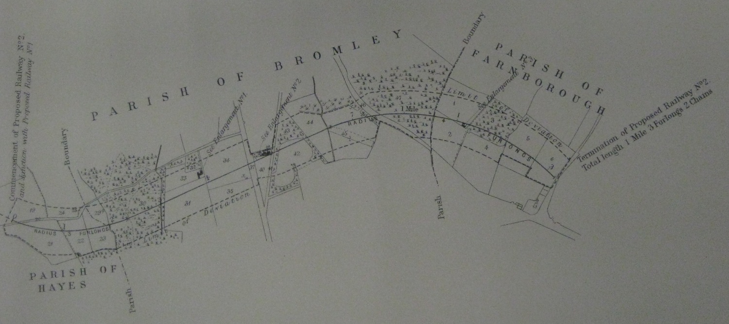 It would then have continued for a further mile and a half terminating in ‘Field 19’ in the village of Farnborough. The map shows that this was actually at Locksbottom by the junction between Hastings Road (A21) and Crofton Road, essentially where the Farnborough Park estate is now. The route was similar to part of the earlier joint proposal by the London Chatham and Dover and Southeastern Railways.