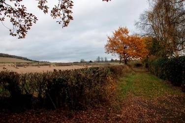 Continuing straight across the roundabout, the road heads toward Chevening, parallel with the M25. After a short while it bends to the left. The old entrance starts alongside the cottages shown in the photo above. It extends for about on mile and emerges behind the churchyard of St. Botulph's church in Chevening.