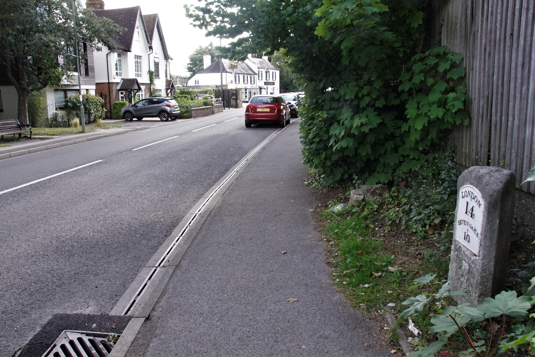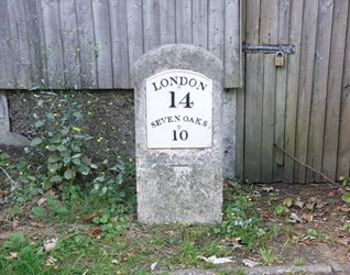 Thin, rectangular milestone with plate which reads LONDON/14/SEVENOAKS/10. Located on the New Cross Turnpike road of 1718.