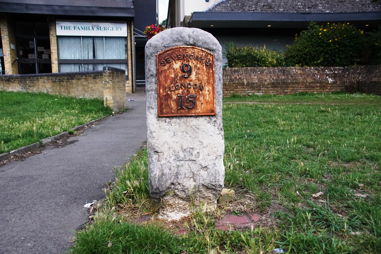 Thin, rectangular milestone with plate which reads SEVENOAKS/9/LONDON/15. Located on the New Cross Turnpike road of 1718.