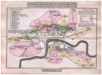 The New Cross Turnpike. numbered 14 and shown in yellow in the map, leads toward Bromley and Farnborough. The painting below is of the toll gate in Deptford at the start of the turnpike route toward Kent.